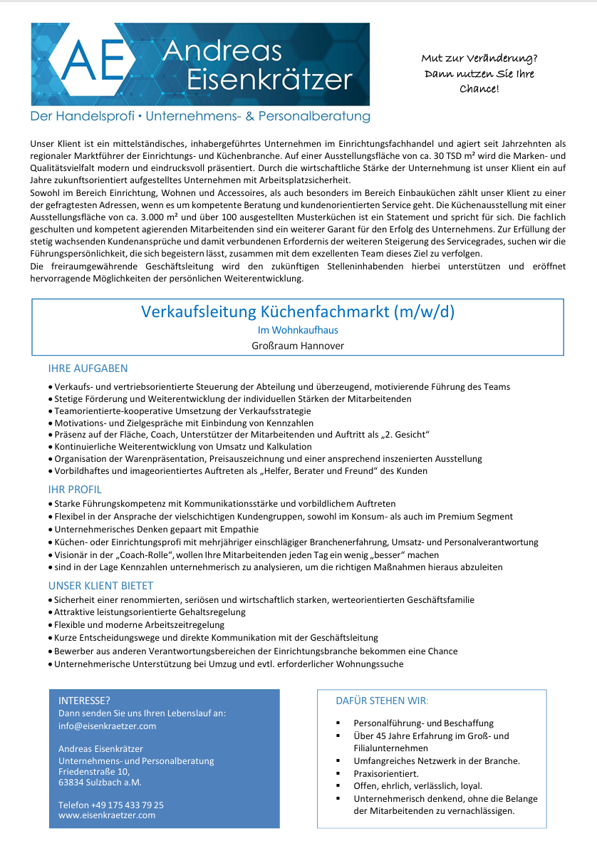 Sollte diese Positionsbeschreibung Ihr Interesse geweckt haben, freue ich mich über Ihre Kontaktaufnahme!